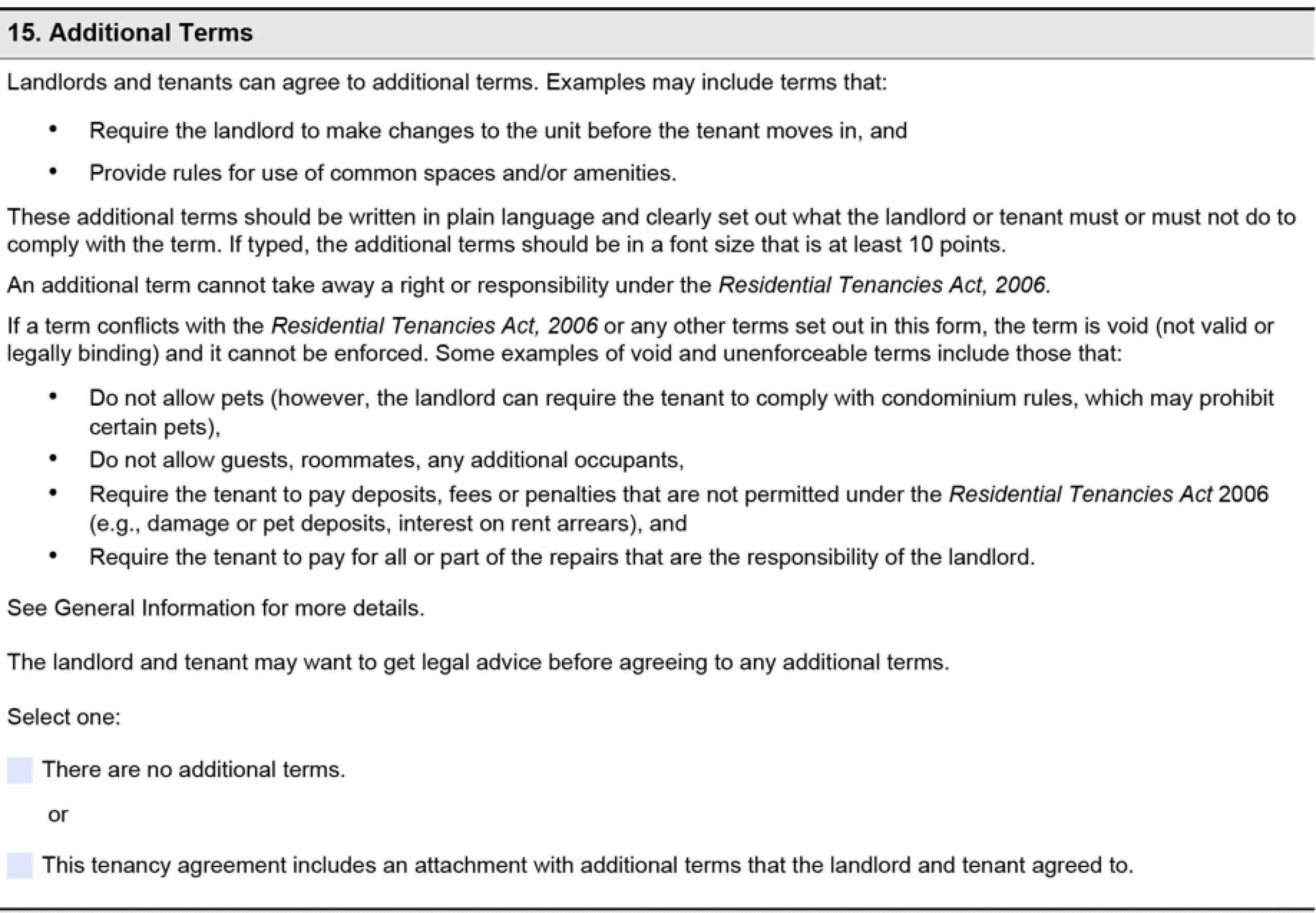 • A new “additional terms” section allows landlords to add further clauses and documents to the rental agreement, with the tenant’s consent. However, the main 15 clauses take precedence over these additional terms.