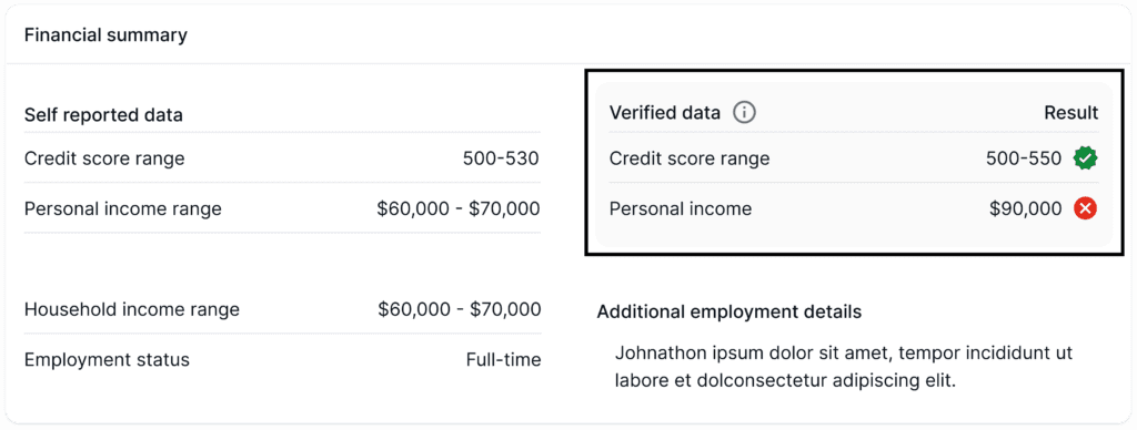 - Income: Open banking information is reviewed for important insights into a tenant’s financial status, including their monthly employment and non-employment income trend.