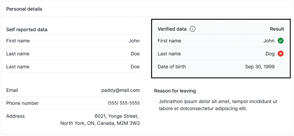 - Personal ID: Certn uses a proprietary solution with a simple selfie, a snapshot of the tenant’s ID, and biometric facial recognition to confirm their identity. Â