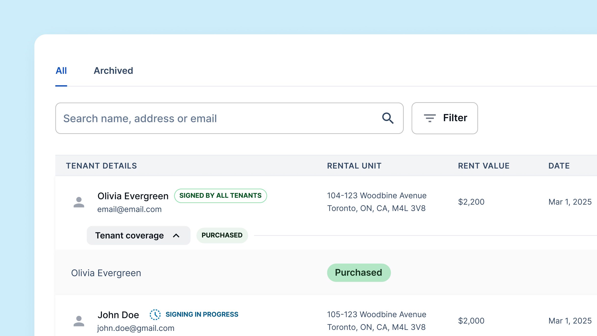 During the lease signing experience, we will offer the tenant the option to purchase renter’s insurance through our partners at Duuo (The Cooperators Subsidiary). This is an optional, unless you (the landlord) make it a required step for the renter to show proof of insurance before they are able to sign the lease.
