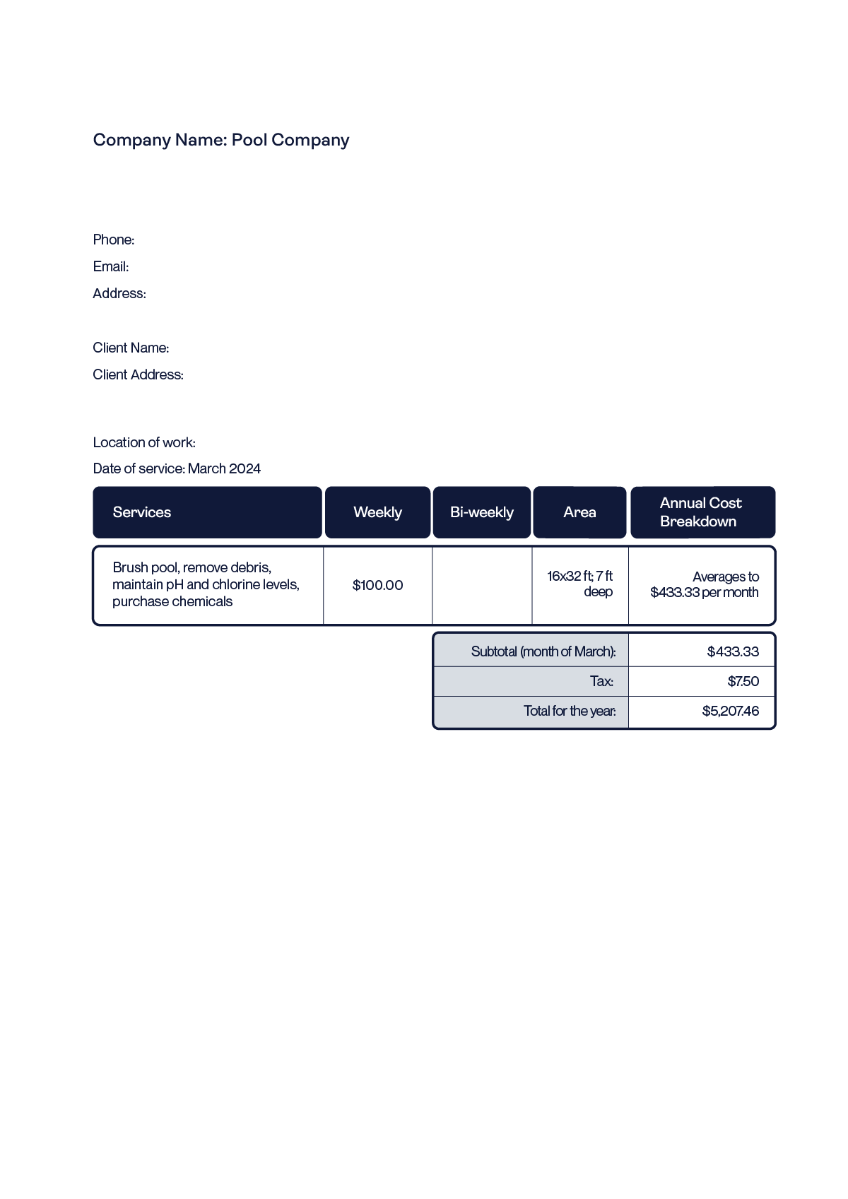 Many contributing factors affect the cost of pool services. First and foremost, there is the pool’s size, shape, and type. For instance, is it an in-ground, infinity, or above-ground pool? What shocking chemicals and methods are required? The amount of sunlight, extreme weather, travel time, and frequency you need maintenance can hike up the costs. Ask the pool person about their experience with your specific type of pool, how they would handle leaks, and if they can provide a written estimate for weekly or monthly visits. The average annual costs for standard pool maintenance tasks can range from $960 to $1,800 annually. The pool service should provide the following in a quote:- Maintenance services offered (skimming, vacuuming, chemical balancing, inspection)