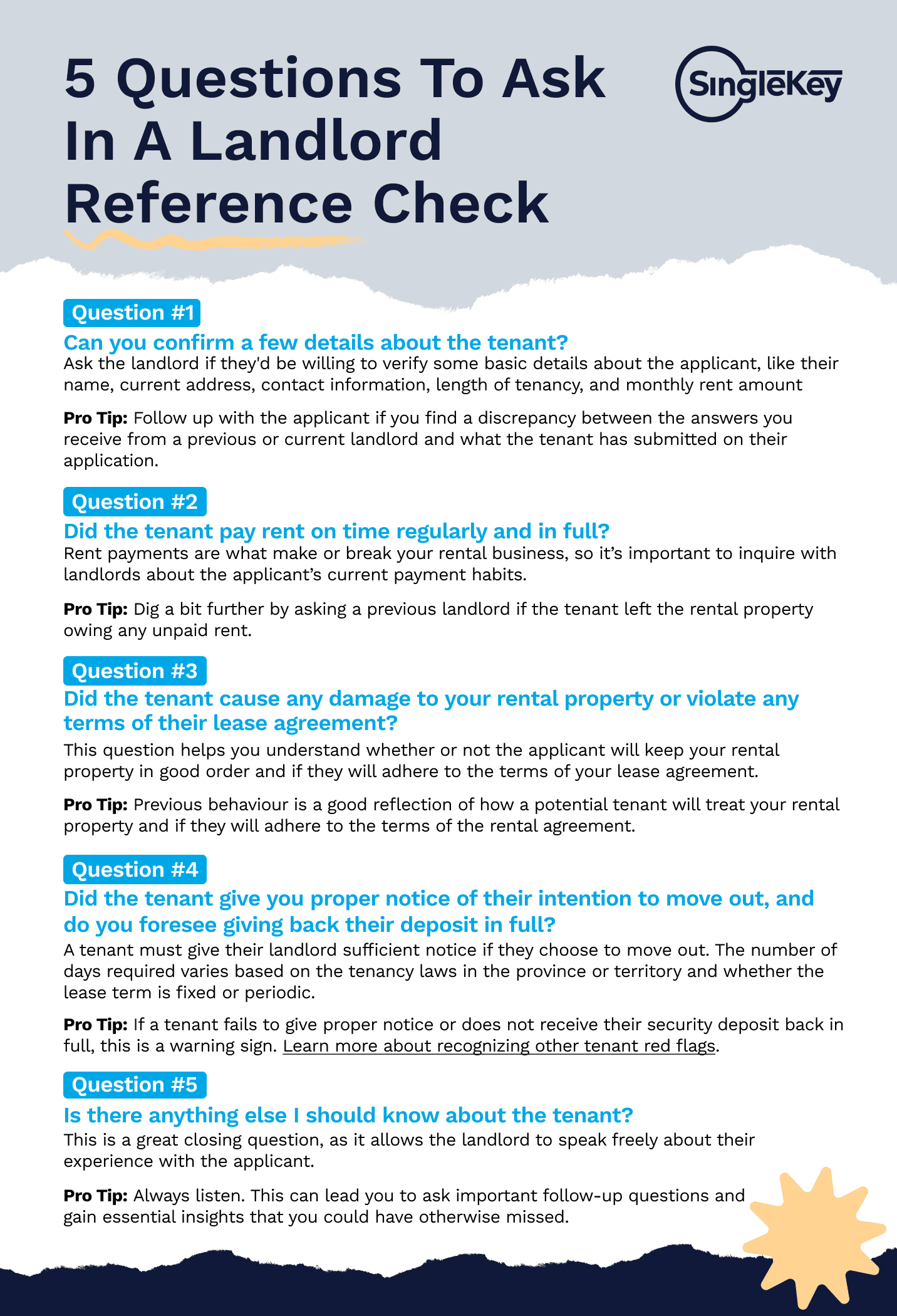 Pro Tip: Always listen. Take the time to digest the information you get during a landlord reference check. This can lead you to ask important follow-up questions and gain essential insights that you could have otherwise missed.Â