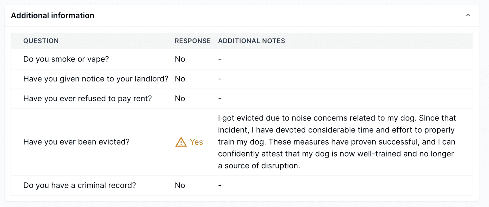 This section usually lists any other facts about an applicant not found anywhere else in the report. Depending on what information they have chosen to disclose, you’ll know whether they smoke, have declared bankruptcy, provided their current landlord with proper notice, or have been convicted of a serious crime. They’re also given the opportunity to explain their answers further here.