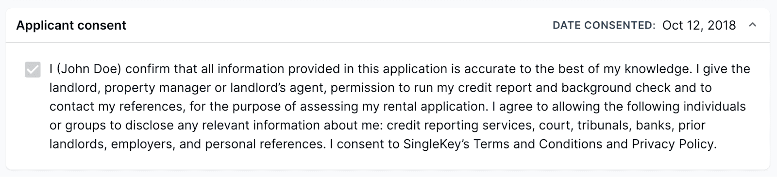 In most jurisdictions, this is required before you can conduct landlord and employment reference checks. You would be expected to produce this confirmation before another party discloses any personal information about the applicant. By checking this box, the applicant provides their consent and guarantees the information they’ve supplied you with is truthful and accurate.
