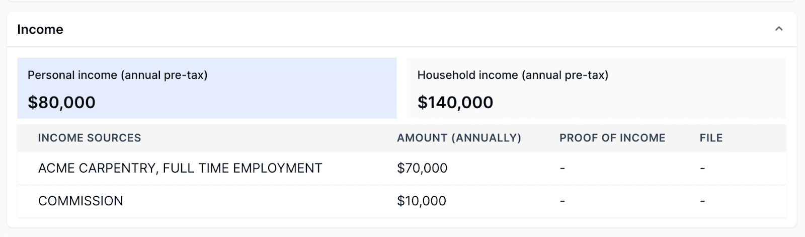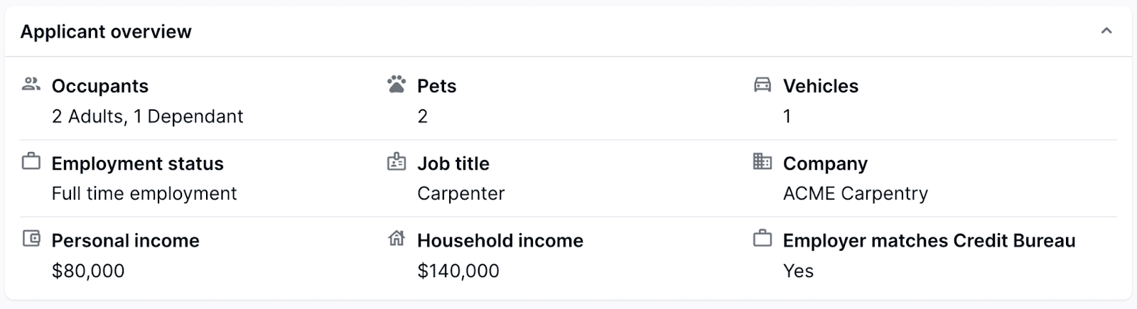 The details in the applicant overview give you basic information about the individual, such as their employment status, job title, personal income, household income, pets, vehicles, and the number of people expected to occupy the rental. There may also be a note that confirms that their employer info matches the credit bureaus’ records.