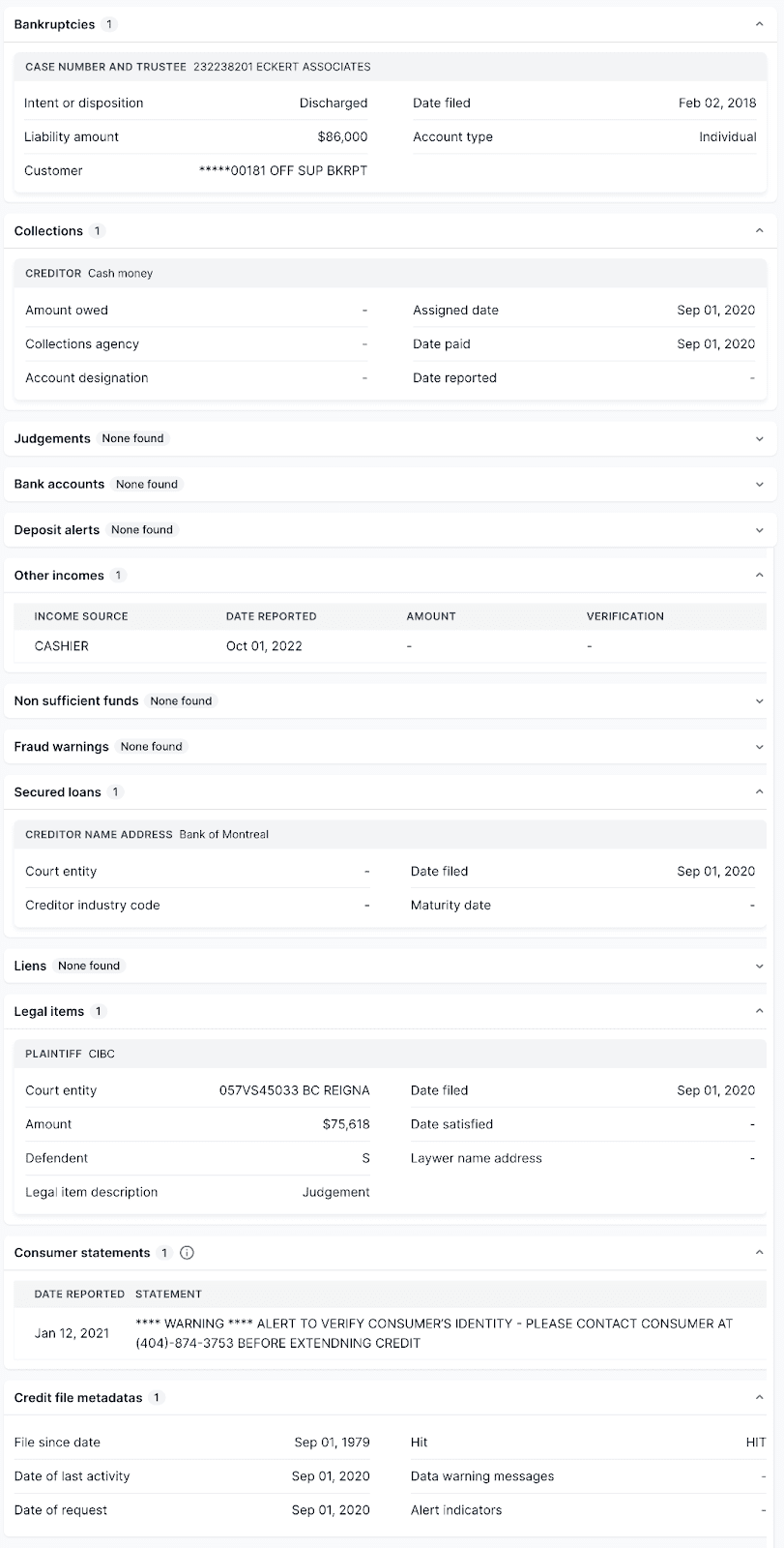 This section contains various reported alerts. Some of the most common ones to be concerned about are bankruptcies, collections, and judgments. Any hits here warrant further investigation by the homeowner or property manager, as these are in most cases negative indicators.