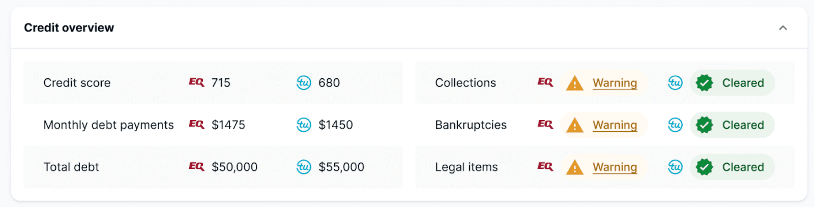 This section summarizes the most crucial points from the applicant’s credit check. It usually contains the credit score, monthly debt payment size, total debt owed, and negative remarks, such as bankruptcies and accounts sent to collection agencies.