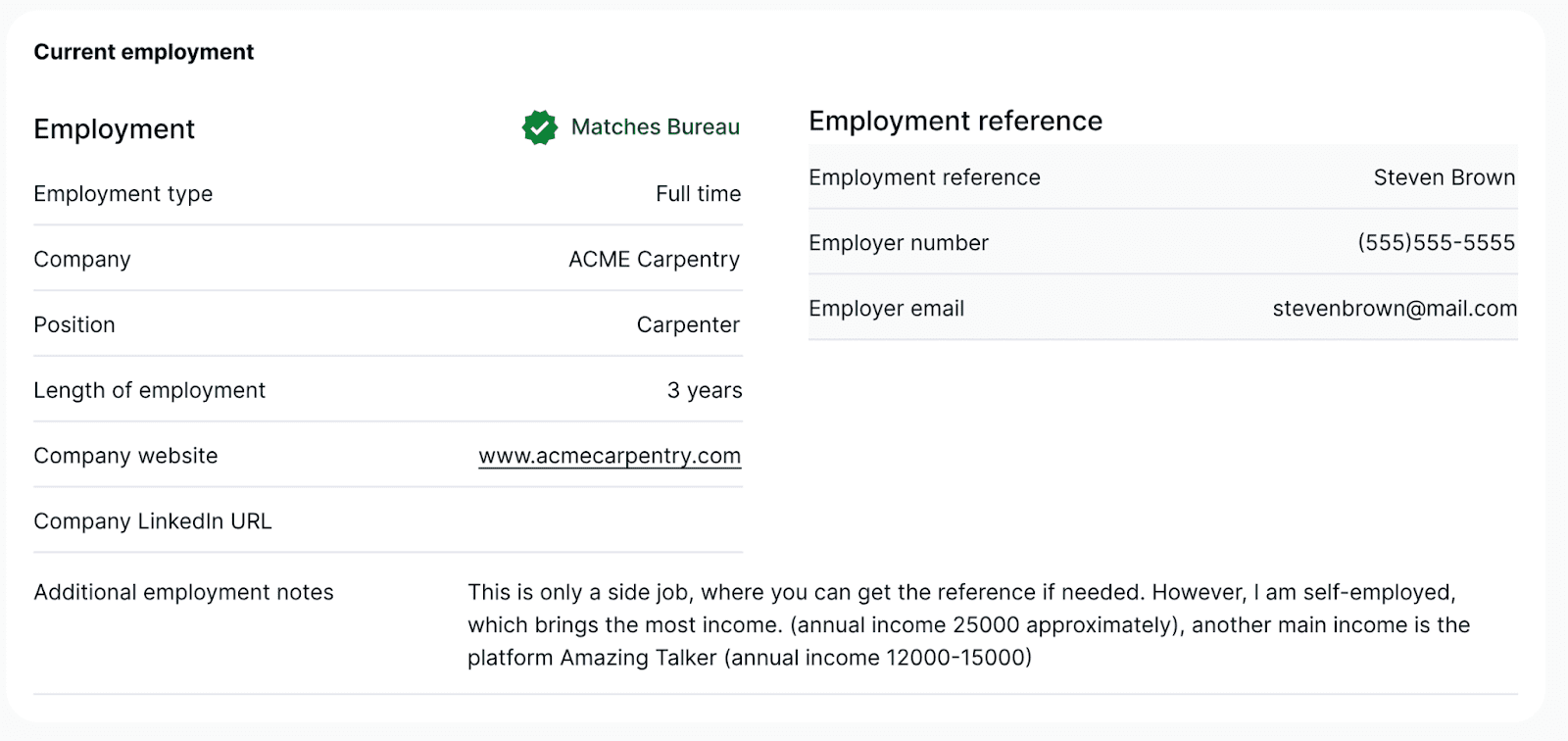 The tenant’s employment data matches what was reported to the credit bureau when you see the green “Matches Bureau” checkmark.
