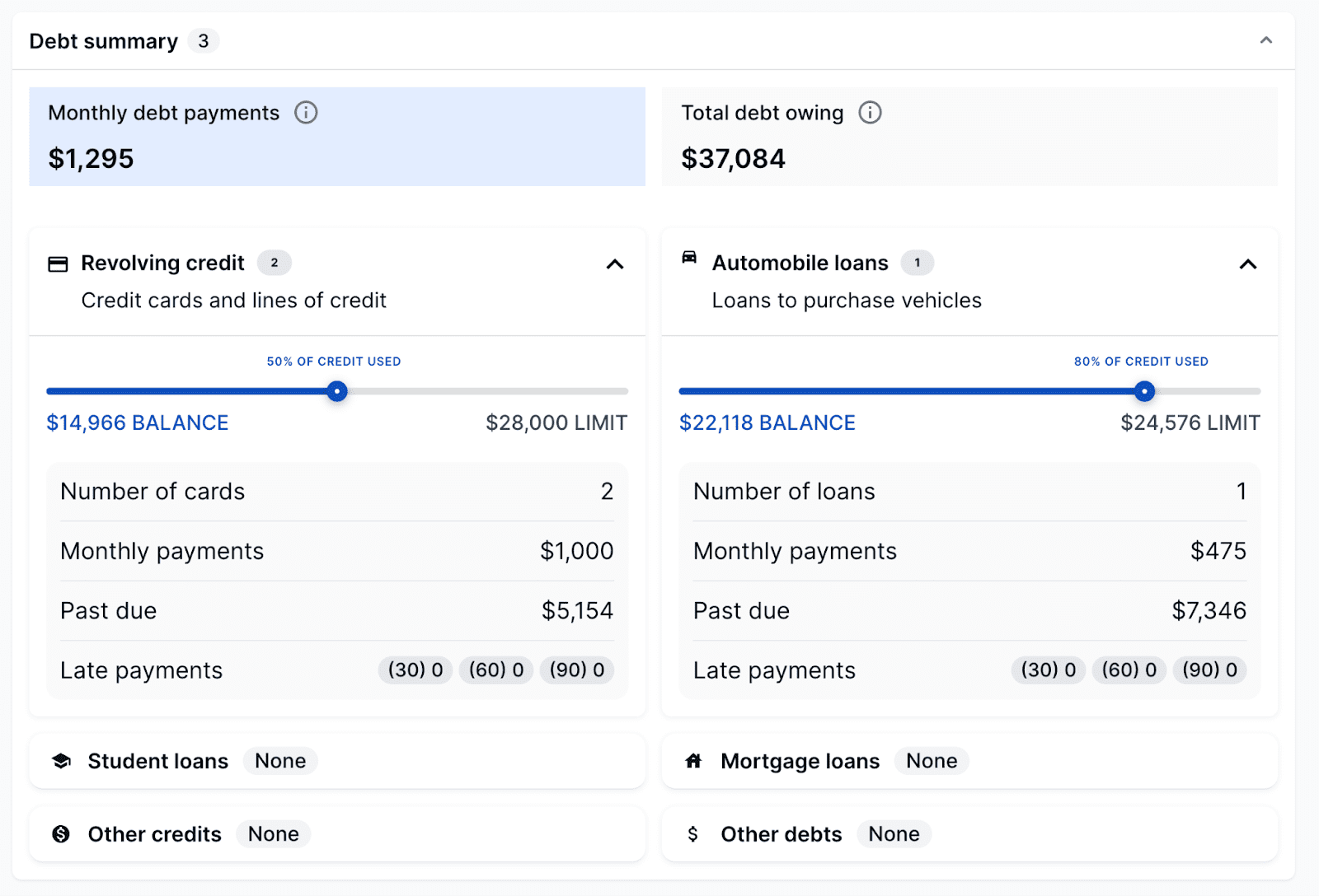 This section summarizes all of the outstanding debt or credit utilized by the individual. It’s broken into two categories: