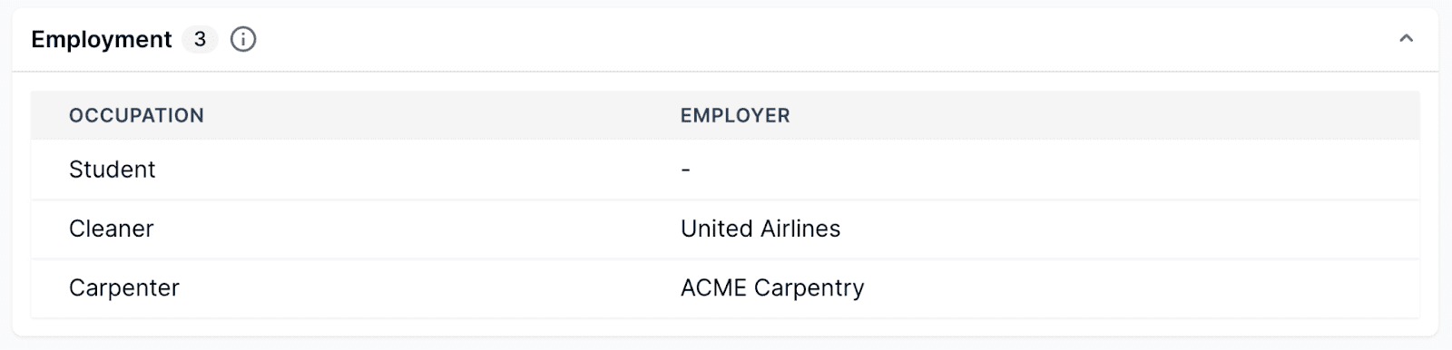 If an individual has given a creditor information about where they work, those employment details will be listed in this section. Lenders typically ask for employer information on credit applications to help verify a person’s identity, but they’re not obligated to report this history to the credit bureaus.