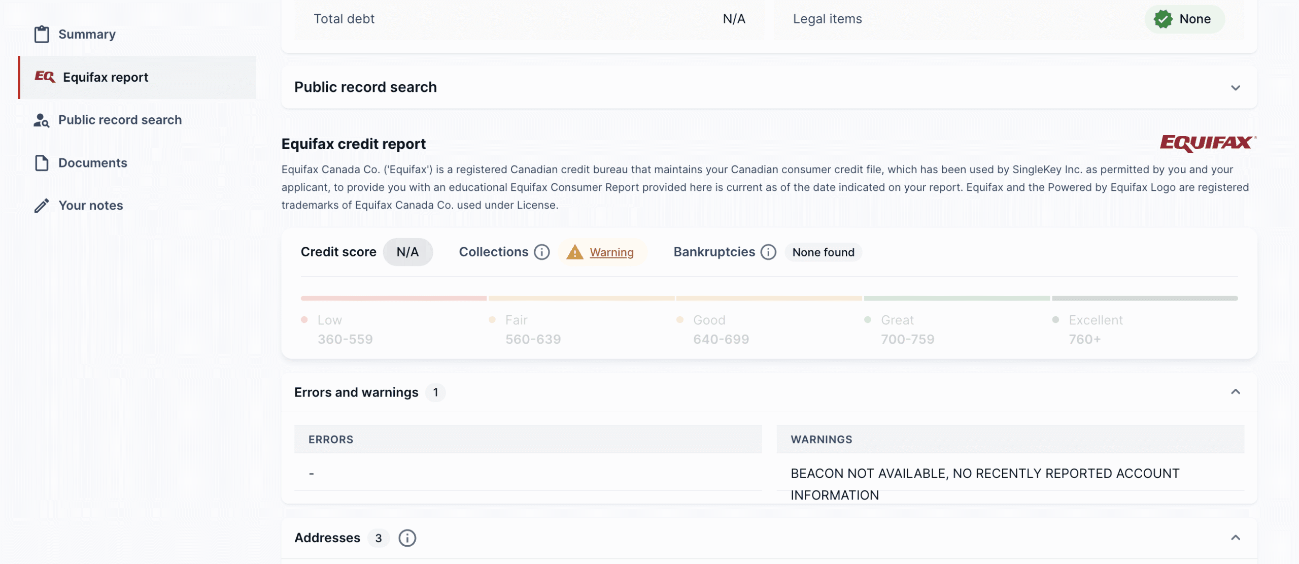This part of the tenant screening report is taken directly from the credit bureau. SingleKey users may choose credit checks from Equifax, TransUnion, both of these bureaus, or Nova Credit when screening international tenants. You can find out more about the difference between Equifax and TransUnion credit reports here.