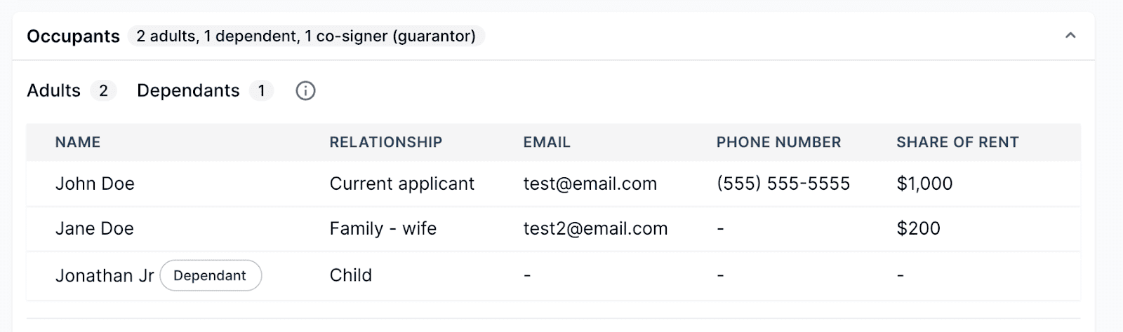 If additional people are moving in with the applicant, their names, contact information, share of the rent, and other key details will be listed here.