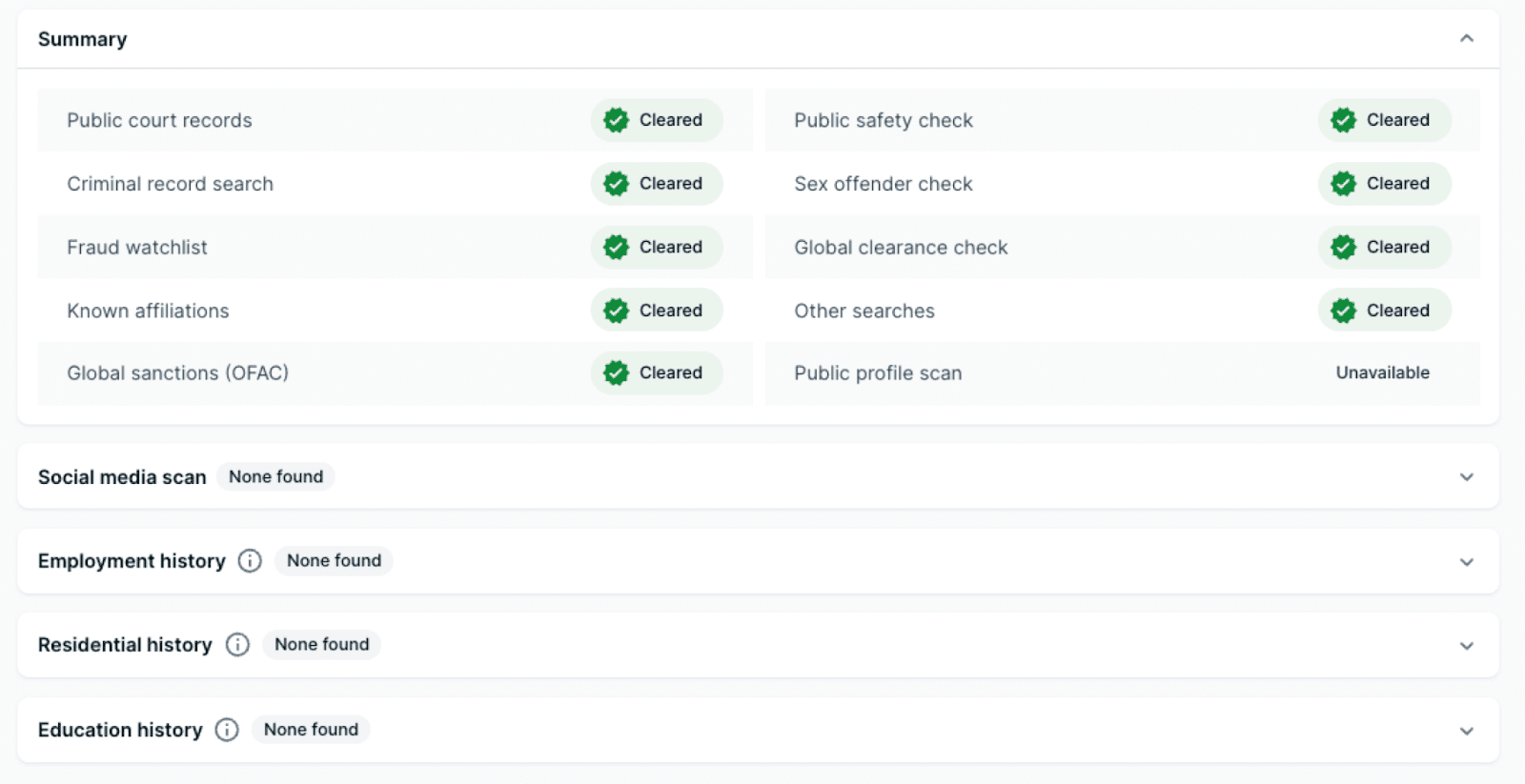 In the public record overview, you’ll find the results of a scan of publicly available information related to the applicant. If their history includes items like problematic behavior, court appearances, or criminal activity, a “warning” icon will appear. If there are no results from the public scan, they’ll be marked as “cleared.”