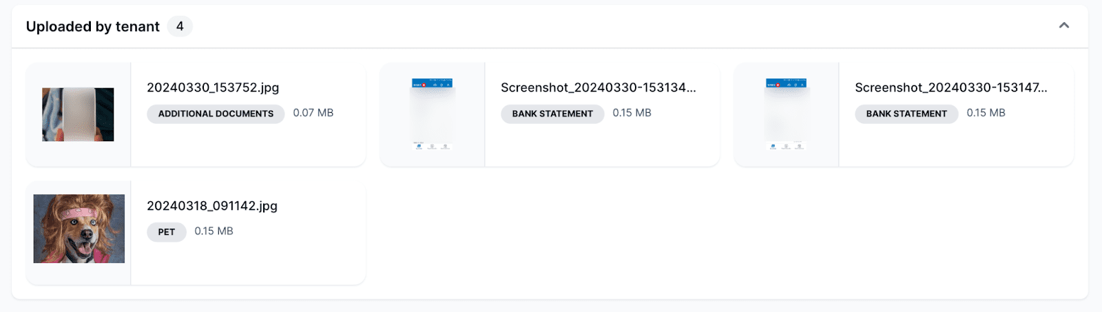 You’ll find a collection here of all the files uploaded by the applicant. These may include their government-issued ID, pet photos, bank statements, pay stubs, and a work permit. The applicant is free to add any documentation they want or that you request. Each preview contains a thumbnail, file name, category tag, and file size. You can choose which document types are mandatory or optional.
