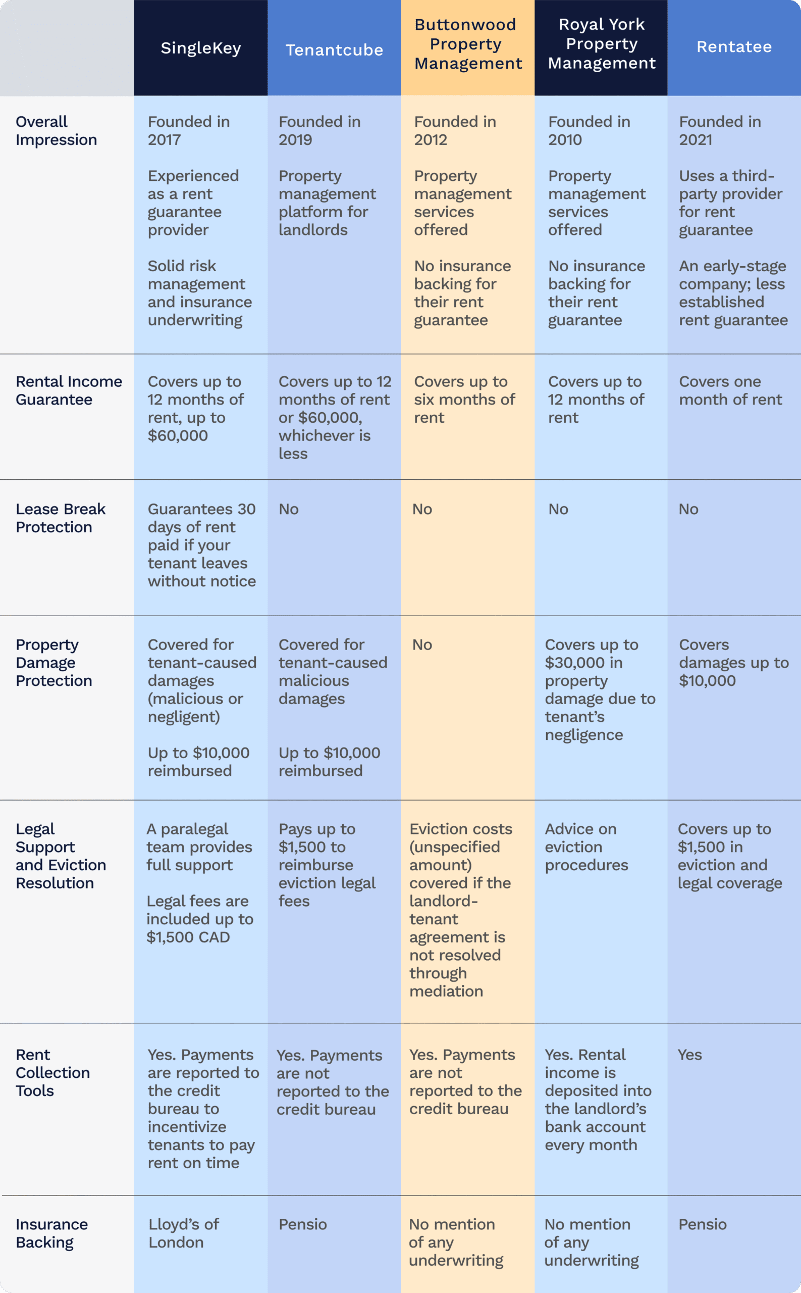 Choosing a rent guarantee program that fits your needs is essential to ensure your success as a landlord. Here’s a side-by-side comparison of rent guarantee programs provided by SingleKey and its competitors.