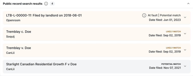 The public record search is a feature of the Tenant Screening Report that scans open databases like Openroom, CanLII, and SOQUIJ to see if there’s a match in their court records with the name of the rental applicant. Here’s an example of how this data is summarized in a report so you can quickly spot warnings and potential red flags: