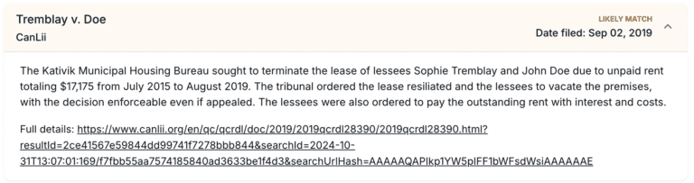 Clicking on each result expands the court record for a summary of the case (if available). You’ll also get a direct link to the source for full details. Here’s a sample result pulled from CanLII: